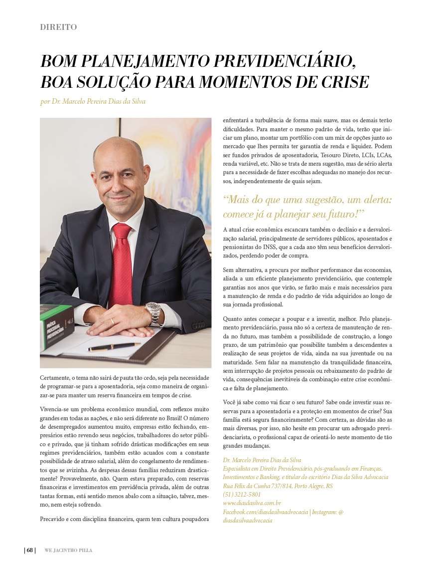 Confira agora a matéria completa concedida pelo titular do escritório e especialista em Direito Previdenciário, Marcelo Dias da Silva, para a Revista WE deste mês.